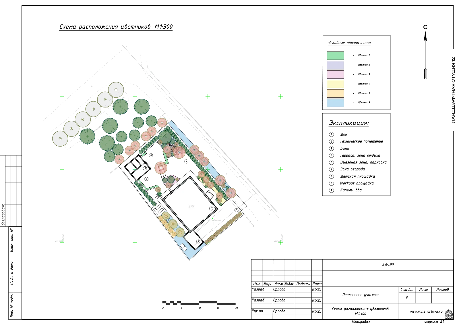 Терраса и тропинки сада выполнены из деревянного покрытия, объединяя все строения и посадки в единое целое. На настиле располагается зона отдыха, декоративные кашпо/грядки, купель, зона bbq.